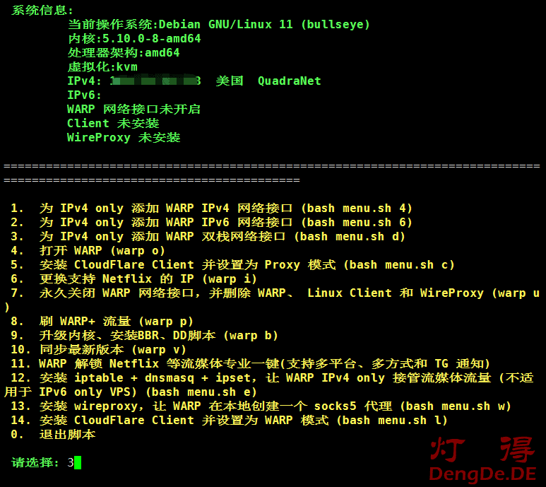 (4)我们可以根据自己VPS的情况选择相应的选项,选择“3. 为 IPv4 only 添加 WARP 双栈网络接口 (bash menu.sh d)”,下一步默认即可。