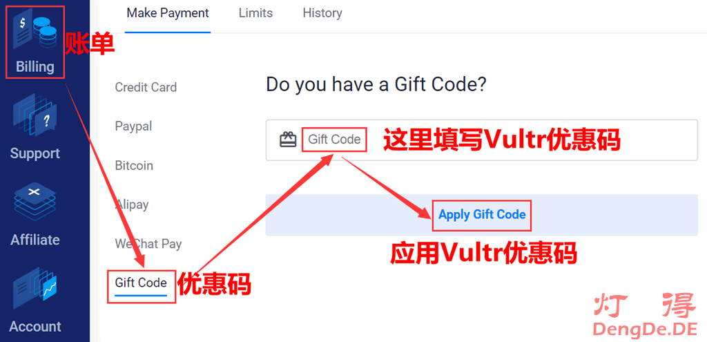 温馨提示:如果你有Vultr优惠码的话,还可以先点击“Gift Code”,然后在“Gift Code”输入框里填写Vultr优惠码并点击“Apply Gift Code”以激活应用。但是不幸的是,Vultr官方很少放出优惠码,目前是没有任何优惠码,因为现在已经非常优惠的活动了。如下图所示: